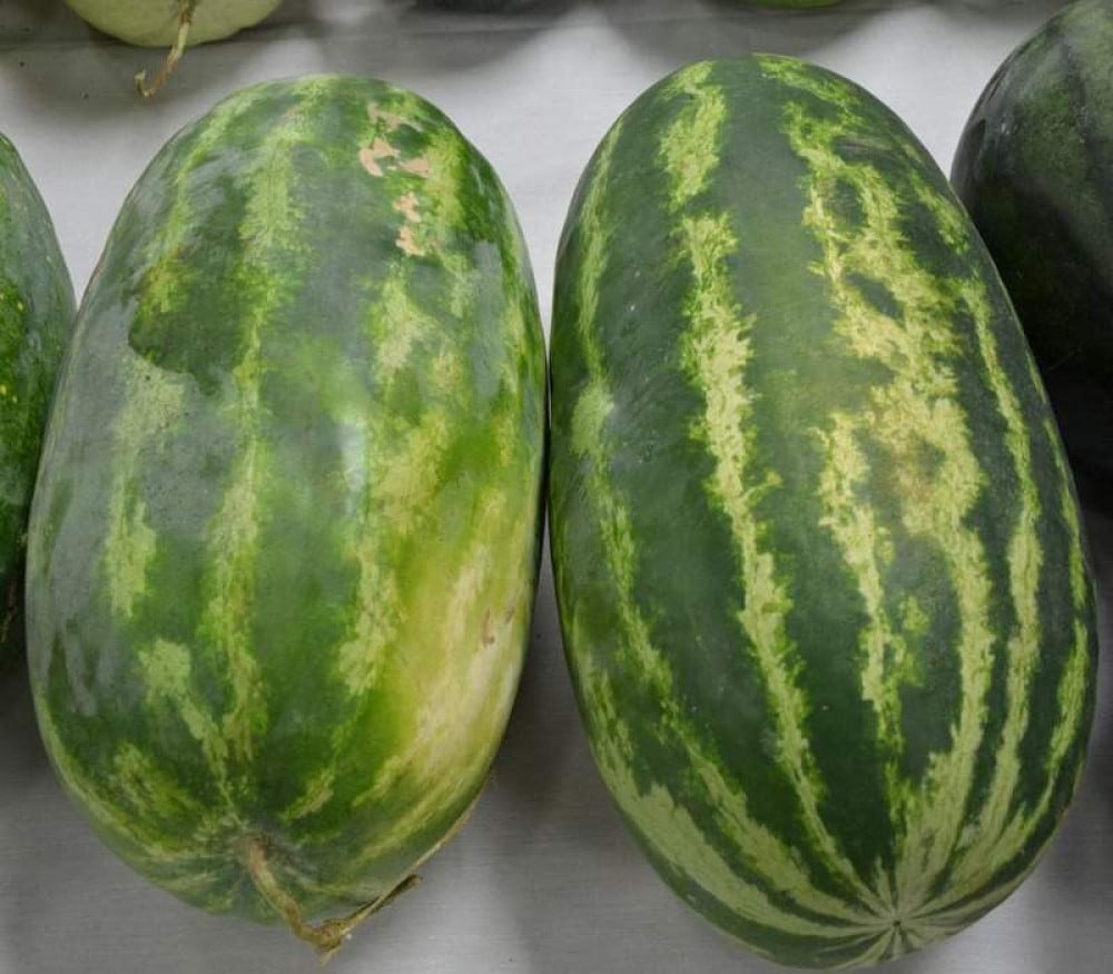 بطيخ مستطيل كبير بلحم أصفر و قشرة خضراء داكنة مميزة بخطوط خضراء افتح