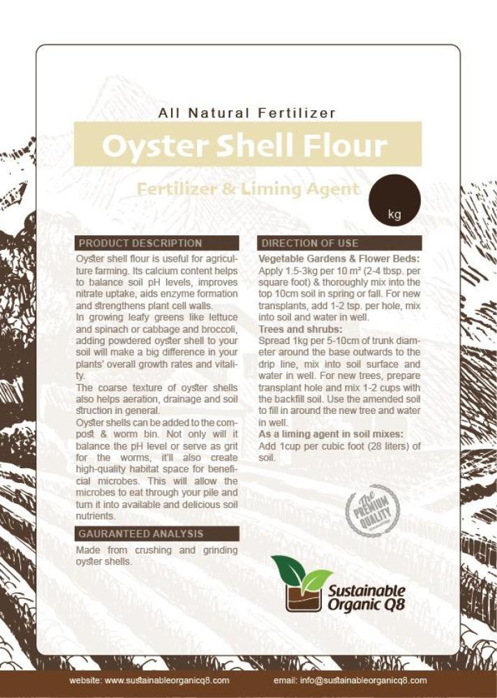 Oyster shell flour is useful for agriculture farming. Its calcium content helps to balance soil pH levels, improves nitrate uptake, aids enzyme formation and strengthens plant cell walls.