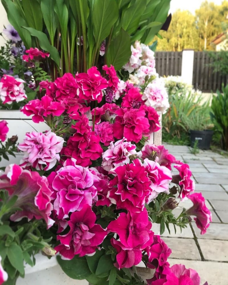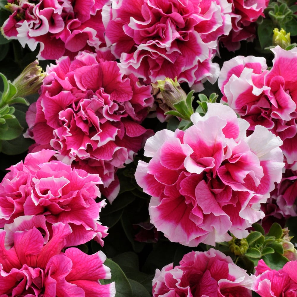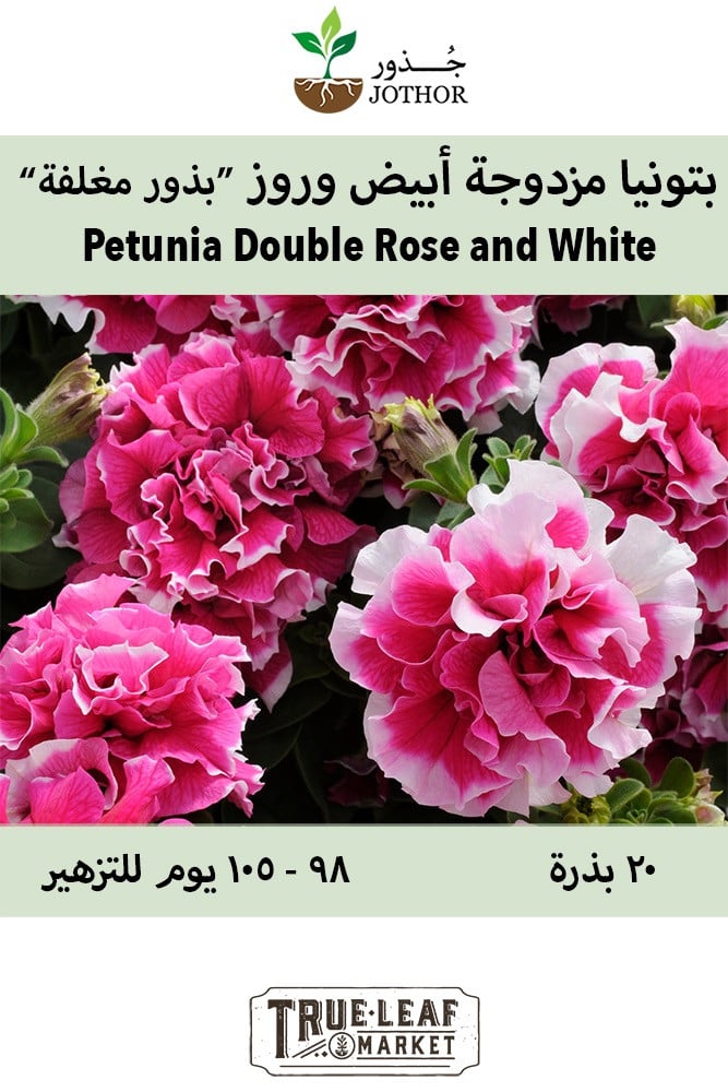 أزهار مزدوجة البتلات وثنائية اللون بقطر 7 سم ، يصل إرتفاع النبتة 25-38 سم