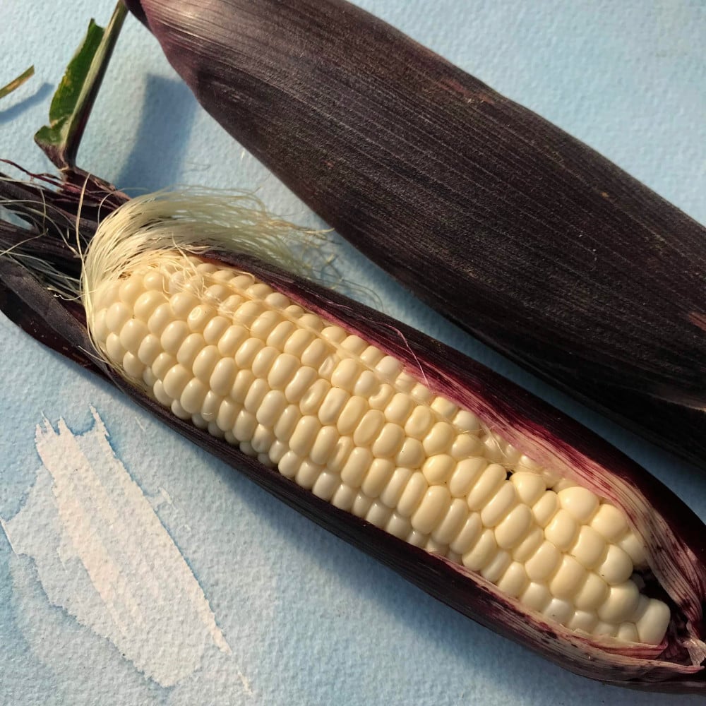 لونها مميز لافت للنظر الأكواز والقشرة بنفسجية وحباتها بيضاء كالؤلؤ، نكهة هذه الذرة الفريدة من نوعها هي أكثر تقليدية - أقل حلاوة قليلاًمن بعض الاصناف السكرية جدا . تحتوي على الأنثوسيانين النافع (مضادات الأكسدة) ، احصدها طازجًة ل، أو انتظر لفترة أطول قليلاًوسيقل الطعم السكري ، لتصبح مثاليًة للخبز أو الشوربة ، أو انتظر لفترة أطول للحصاد ، واستخدم الحبوب المجففة للدقيق