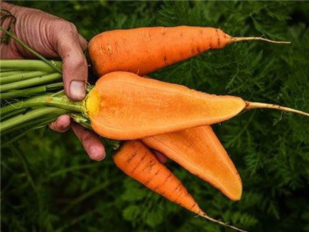 طول الجزر 15 سم جزر عريض مع نهايات سميكة مدببة غير حادة بلون برتقالي غامق ومن الداخل بلون برتقالي محمر