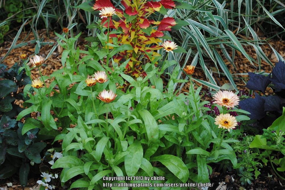 أزهارها بالبتلات ذات اللون البرتقالي اللامع إلى اللون الوردي الفاتح الرقيق ، وتتناقض ببراعة مع القاعدة الصفراء والظهر العنابي.