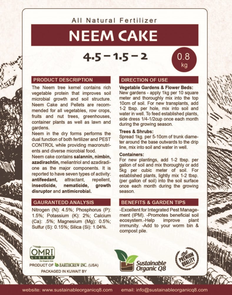 تحتوي بودرة ثمار النيم على بروتين نباتي غني يحسن نمو الميكروبات في التربة وبنية التربة. يوصى باستخدامه لجميع الخضروات والمحاصيل والفواكه وأشجار الجوز والبيوت المحمية والاحواض وكذلك العشب .
