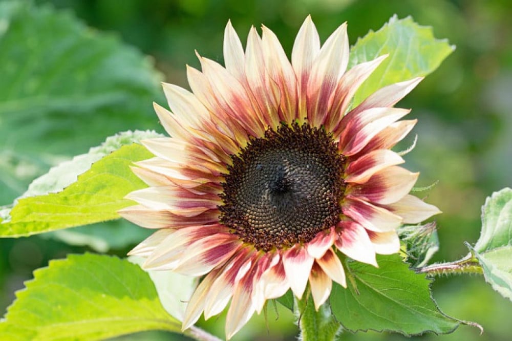 دوار الشمس ببتلات بلون البرغندي، وأحيانًا وردية اللون مع أطراف ليمونية ومراكز داكنة.