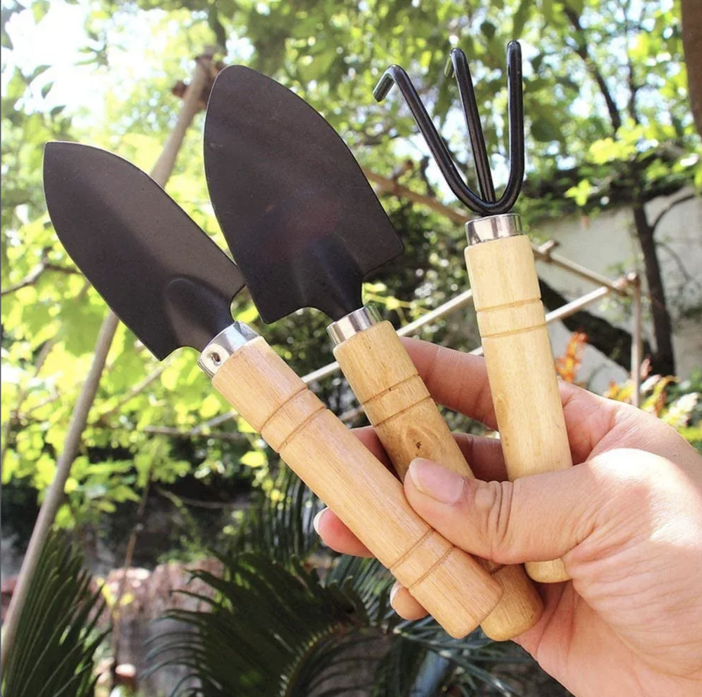 طقم أدوات حديقة مكون من 3 قطع بمقابض خشبية، مثالي للزراعة والعناية بالنباتات بسهولة.