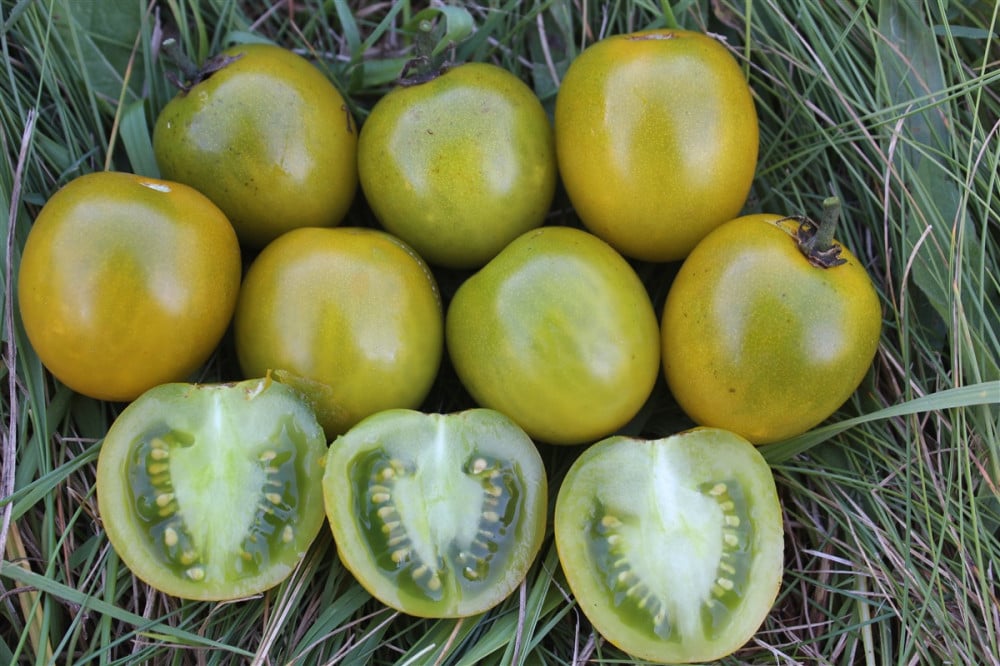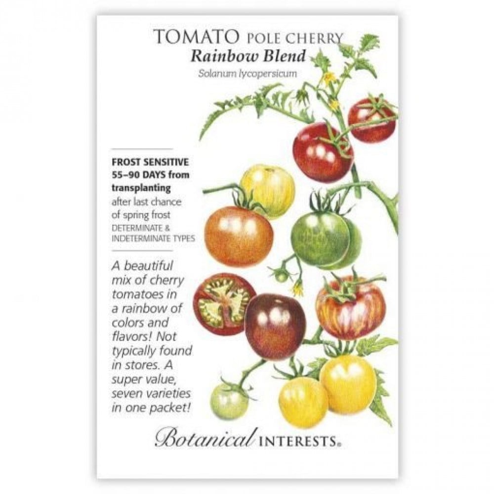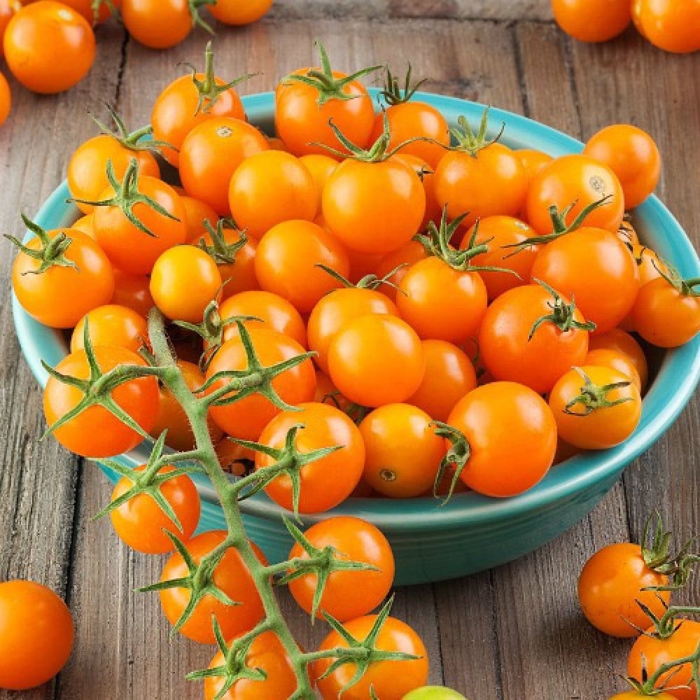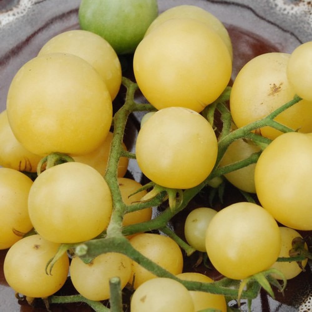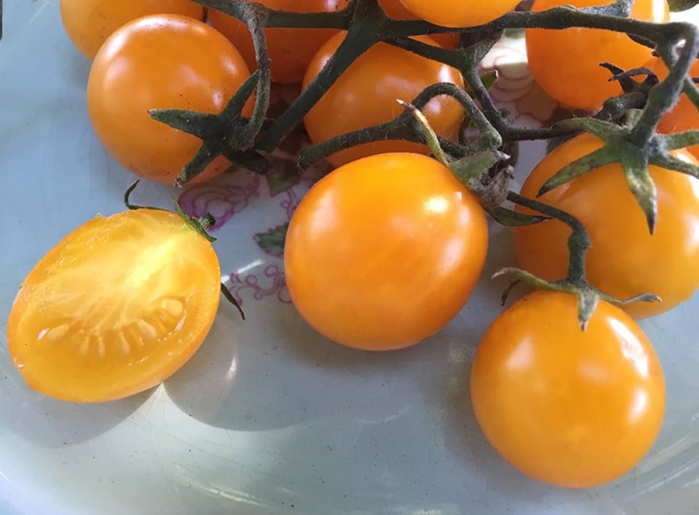 Sundrop' (طماطم برتقالية) ، 'Gold Nugget' (طماطم صفراء) ، 'Chocolate Cherry' (طماطم بنية) ، 'Sweetie' (طماطم حمراء) ، 'Green Grape (طماطم خضراء) ،' Super Snow White (طماطم بيضاء) ، و 'Bicolor Cherry' (طماطم مخططة وردية / بيضاء)