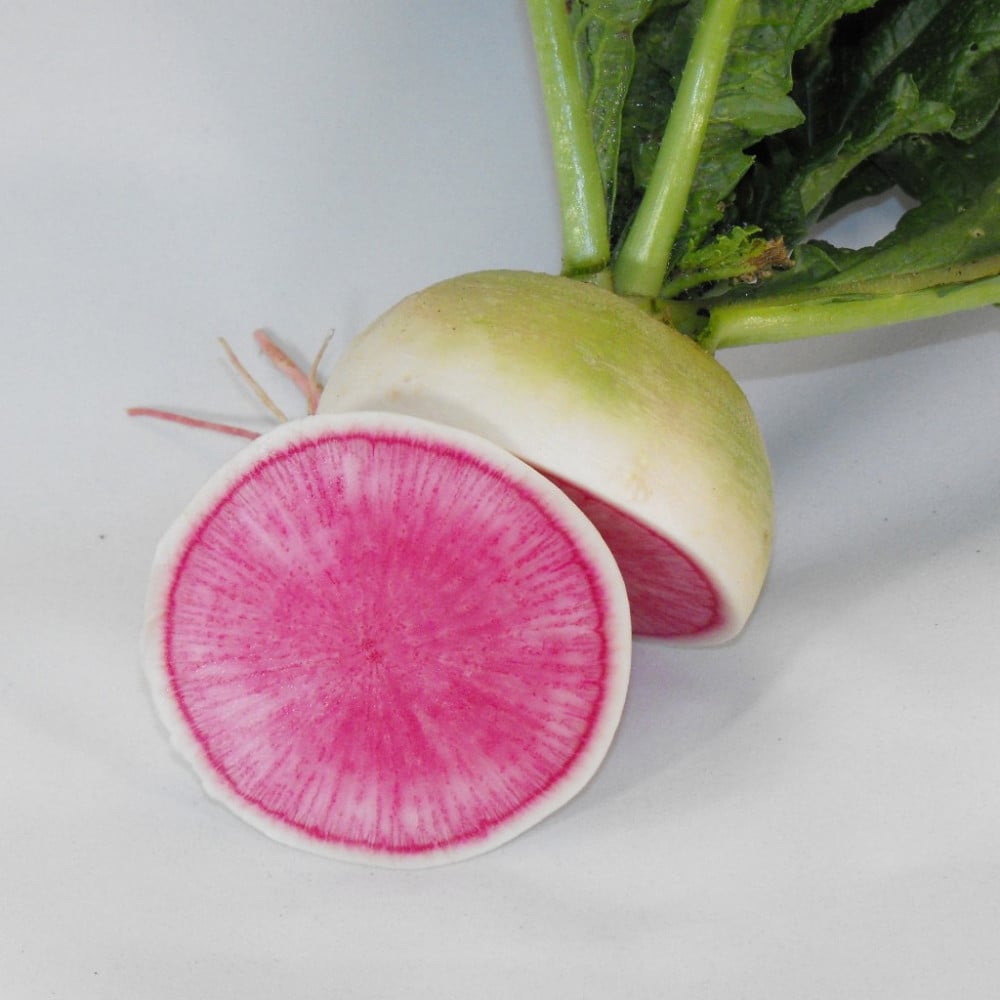 وقد يصل وزنه إلى 450 غرام بلون ابيض مخضر ومن الداخل باللون الفوشي هذا الفجل الهجين ينتج فجل اكثر تناسق من الأنواع الأخرى