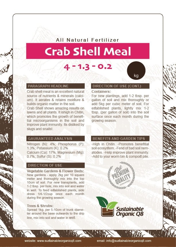 Crab shell meal is an excellent natural source of nutrients & minerals (calcium). It aerates & retains moisture & builds organic matter in the soil.
