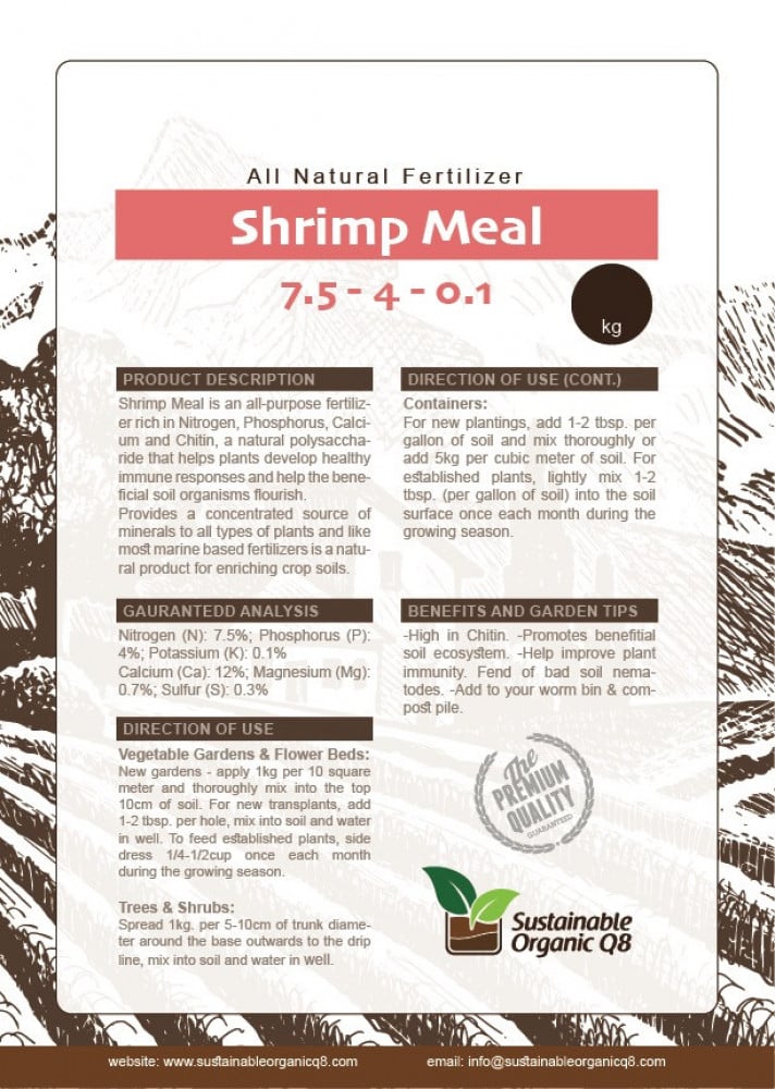 Shrimp Meal is an all-purpose fertilizer rich in Nitrogen, Phosphorus, Calcium and Chitin, a natural polysaccharide that helps plants develop healthy immune responses and help the beneficial soil organisms flourish.