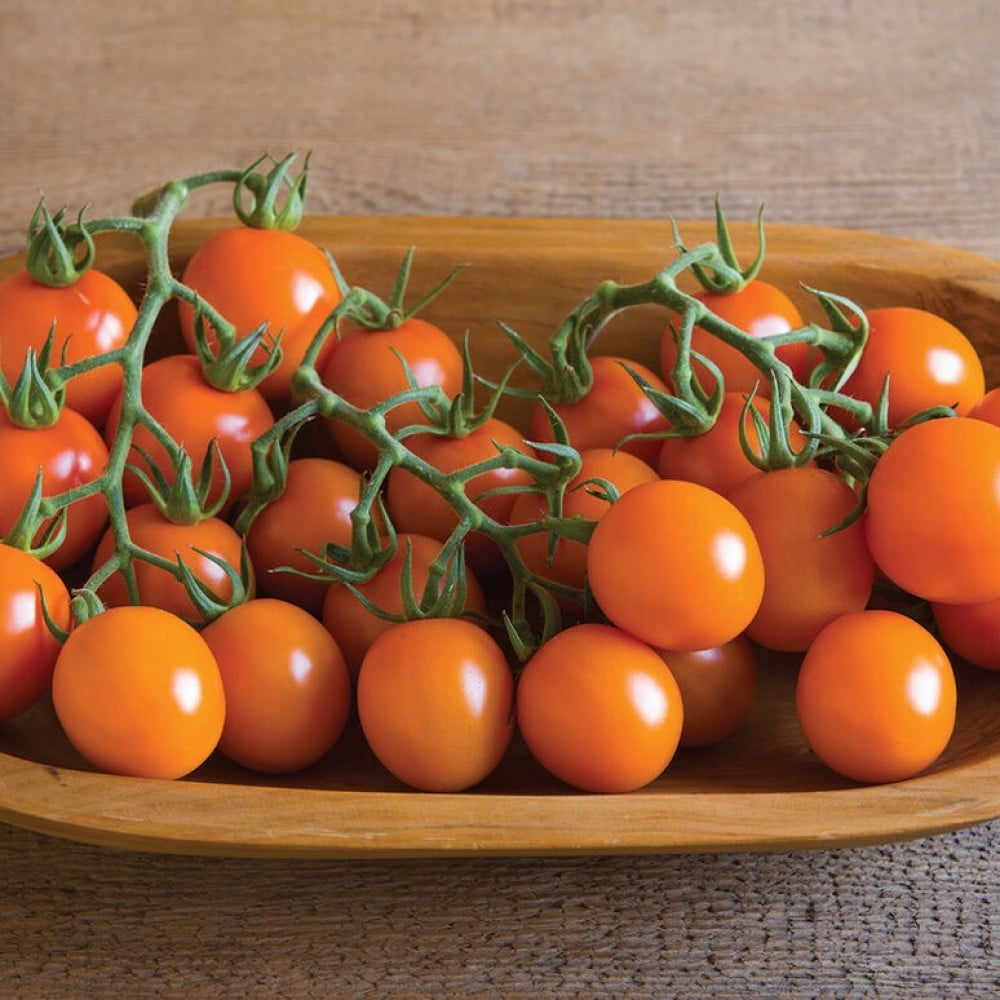 طماطم كليمنتين ذات لون اليوسفي ، بيضاوية الشكل. تنتج النباتات غلة عالية بنكهة جذابة وحلوة.